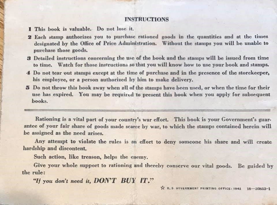 I had heard of these, of course, but never seen or held one until that moment. It was so poignant and powerful to look through them. There were coupons for butter and sugar and other household items; some were missing — presumably spent by her family back in the day. Of course I was not alive then, but from what I’ve been told by family members, people proudly participated in the rationing effort. They pulled together in community and sacrificed for the war, denying themselves for the greater good, and feeling a great deal of pride about serving the cause. Many, of course, made the ultimate sacrifice, of their own lives, or those of their children or spouses. My mom lost her father to the war at the tender age of 9, and very nearly lost her oldest brother as well, who was shot down behind enemy lines and barely avoided capture.
